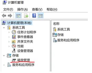 第三步,在打开了计算机管理对话框后,在左侧的菜单栏选中有个存储菜单打开下面的磁盘管理选项。