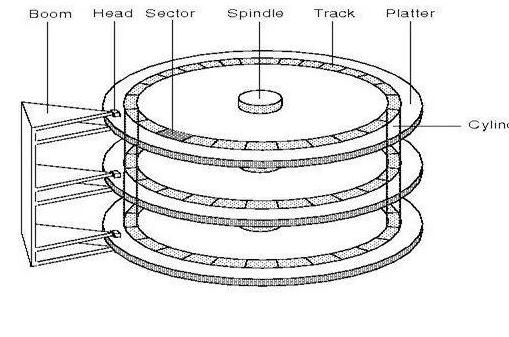 一般来说,硬盘结构包括:磁盘、磁头、磁盘轴、控制电机、磁头控制器、数据转换器、接口、缓存等。所有的磁盘(一般一个硬盘里有多个磁盘,并且磁盘相互平行)都固定在一个主轴上。每个磁盘的存储面上都有一个磁头,磁头与磁盘的距离很小(所以很容易被剧烈的震动损坏)。磁头连接到磁头控制器,以统一控制每个磁头的运动。磁头沿着磁盘的半径方向移动,而磁盘在指定的方向高速旋转,使磁头可以到达磁盘上的任何位置。