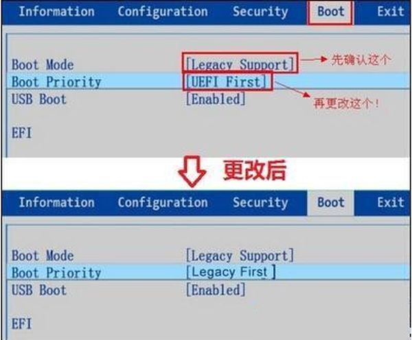 2.以下面的BIOS为例,将引导模式改为旧版支持,先将引导优先级改为旧版,然后按F10保存退出。