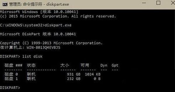 选择磁盘0(0是列表磁盘后显示的硬盘ID,通常为0和1)