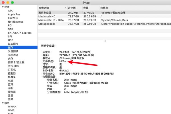第三步:在Mac界面,点击左边的保存,在右边窗口找到文件系统,可以看到Mac硬盘格式。