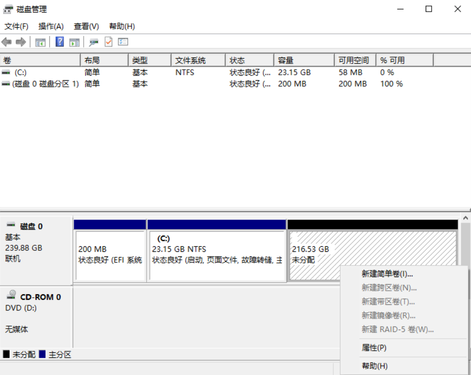 (1)在磁盘上选择未分配的空间,然后从功能列表中点击创建。