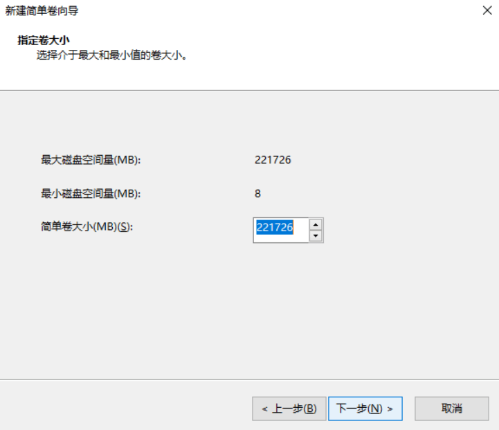 第五步。进入新建简单卷向导界面,点击下一步,指定简单卷的大小。