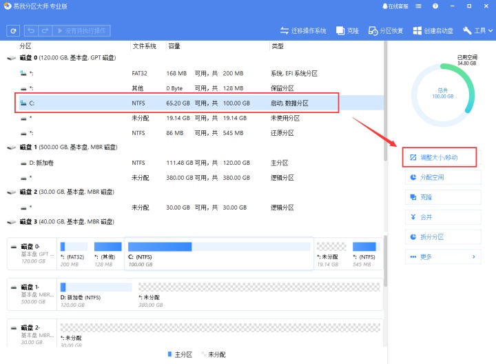 选择需要调整大小或移动的分区,然后从右侧功能列表中选择调整大小/移动。