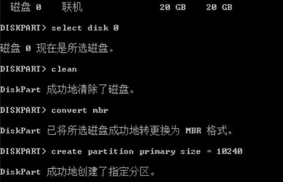 4.输入选择磁盘0的代码,点击回车,然后选择0磁盘。