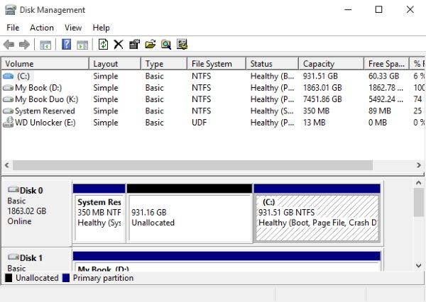 提示:最大化磁盘管理或计算机管理,以查看所有可用的驱动器。任何未分区的驱动器都不在窗口顶部的驱动器列表中。