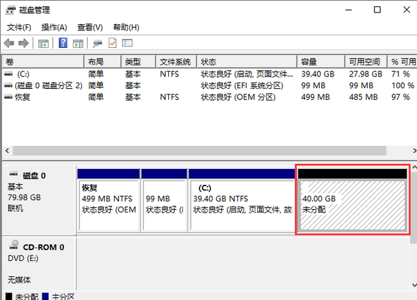 什么是磁盘未分配?打开磁盘管理器(右键单击开始菜单并选择磁盘管理),您可以看到计算机上的硬盘和分区。如下图如图,所示,硬盘上有三个分区,即c盘、OEM分区和EFI分区,都是普通分区。c盘右侧有40GB未分配空间。这个未分配的磁盘空间上没有分区,这意味着这个空间不能用于保存数据。